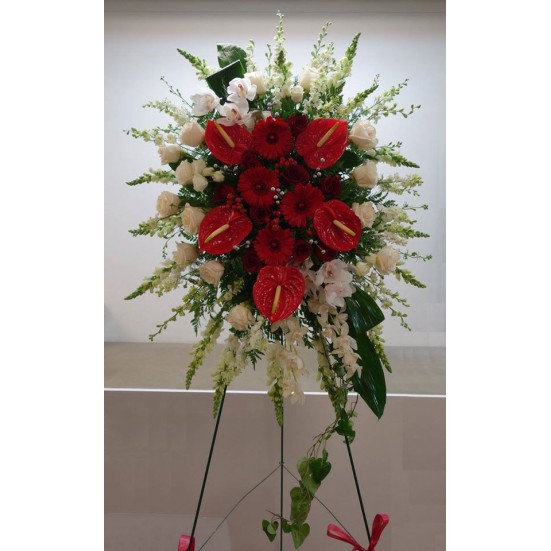 A funeral wreath or spray, presented on an easel, is a beautiful tribute to the deceased.