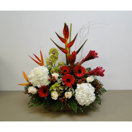 A beautiful sympathy floor basket hand arranged with stunning tropical flowers.