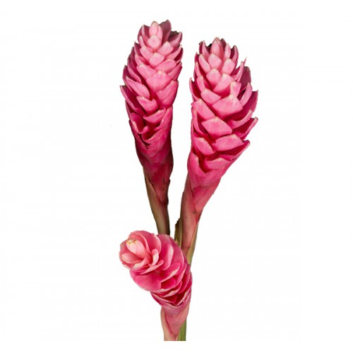 The Ginger plant is characterized by its showy, ostrich-like plumes. Its red and pink bracts are often mistaken for the bloom; however, the actual flower of the plant is the inconspicuous white flower on top. Some species of Ginger are grown for culinary and medicinal purposes, while others are purely ornamental. This exotic perennial, with its unique shape and lovely hues, is increasingly being used for special occasions and weddings.