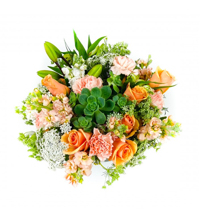 cheerful pops of peach with plenty of lush greenery and succulents.
